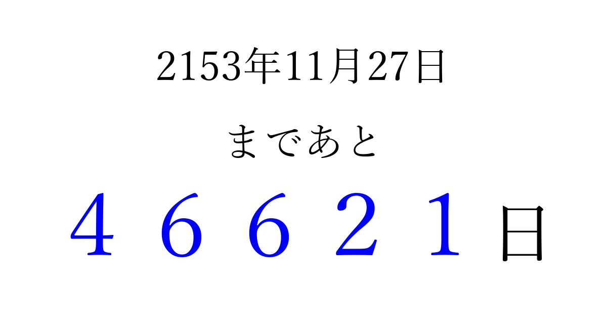 2153年11月27日(火)まで あと 99999 日です 追加すると、トップページからすぐ選べるようになります ※2026/04/06現在の結果です。 最新の状態に更新する ↓シェアして、タイムライン上にカウントダウンを表示しよう!↓ 📤 この結果を共有する Tweet シェア Threads Bluesky 別の日付でカウントダウン 2153年11月のカレンダー このページをブックマークに追加すると、いつでもカウントダウンを確認できます。 (PC: Ctrl+D / Mac: ⌘+D) hitome-notes.comでは以下のページも運営しています。 指定日と期間から日付を計算 | ガチャ確率計算・シミュレーション | プライバシー・ポリシー 運営者:Avocado