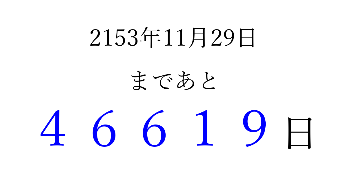 2153年11月29日(木)まで あと 99999 日です 追加すると、トップページからすぐ選べるようになります ※2026/04/10現在の結果です。 最新の状態に更新する ↓シェアして、タイムライン上にカウントダウンを表示しよう!↓ 📤 この結果を共有する Tweet シェア Threads Bluesky 別の日付でカウントダウン 2153年11月のカレンダー このページをブックマークに追加すると、いつでもカウントダウンを確認できます。 (PC: Ctrl+D / Mac: ⌘+D) hitome-notes.comでは以下のページも運営しています。 指定日と期間から日付を計算 | ガチャ確率計算・シミュレーション | プライバシー・ポリシー 運営者:Avocado