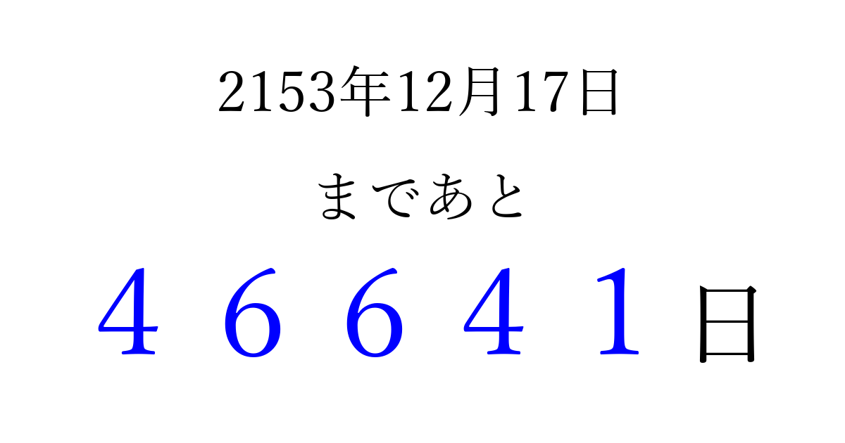 2153年12月17日(月)まで あと 99999 日です 追加すると、トップページからすぐ選べるようになります ※2026/04/06現在の結果です。 最新の状態に更新する ↓シェアして、タイムライン上にカウントダウンを表示しよう!↓ 📤 この結果を共有する Tweet シェア Threads Bluesky 別の日付でカウントダウン 2153年12月のカレンダー このページをブックマークに追加すると、いつでもカウントダウンを確認できます。 (PC: Ctrl+D / Mac: ⌘+D) hitome-notes.comでは以下のページも運営しています。 指定日と期間から日付を計算 | ガチャ確率計算・シミュレーション | プライバシー・ポリシー 運営者:Avocado