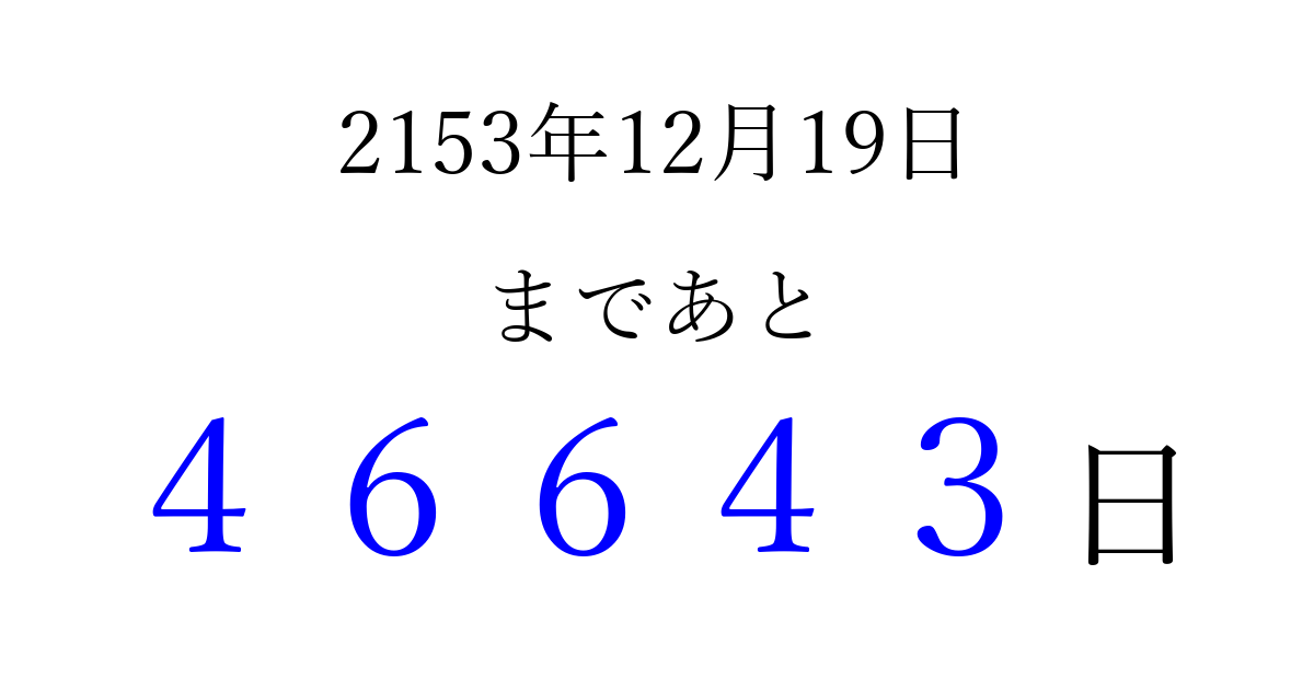 2153年12月19日(水)まで あと 99999 日です 追加すると、トップページからすぐ選べるようになります ※2026/04/06現在の結果です。 最新の状態に更新する ↓シェアして、タイムライン上にカウントダウンを表示しよう!↓ 📤 この結果を共有する Tweet シェア Threads Bluesky 別の日付でカウントダウン 2153年12月のカレンダー このページをブックマークに追加すると、いつでもカウントダウンを確認できます。 (PC: Ctrl+D / Mac: ⌘+D) hitome-notes.comでは以下のページも運営しています。 指定日と期間から日付を計算 | ガチャ確率計算・シミュレーション | プライバシー・ポリシー 運営者:Avocado