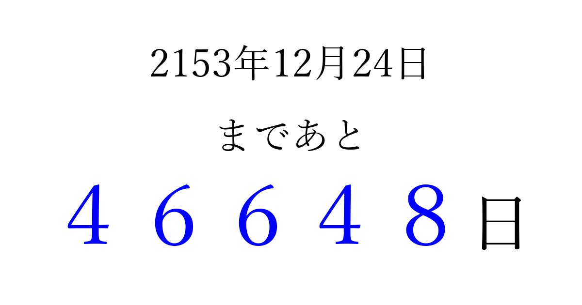 2153年12月24日(月)まで あと 99999 日です 追加すると、トップページからすぐ選べるようになります ※2026/04/06現在の結果です。 最新の状態に更新する ↓シェアして、タイムライン上にカウントダウンを表示しよう!↓ 📤 この結果を共有する Tweet シェア Threads Bluesky 別の日付でカウントダウン 2153年12月のカレンダー このページをブックマークに追加すると、いつでもカウントダウンを確認できます。 (PC: Ctrl+D / Mac: ⌘+D) hitome-notes.comでは以下のページも運営しています。 指定日と期間から日付を計算 | ガチャ確率計算・シミュレーション | プライバシー・ポリシー 運営者:Avocado