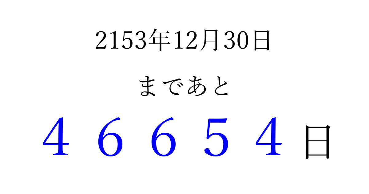 2153年12月30日(日)まで あと 99999 日です 追加すると、トップページからすぐ選べるようになります ※2026/04/06現在の結果です。 最新の状態に更新する ↓シェアして、タイムライン上にカウントダウンを表示しよう!↓ 📤 この結果を共有する Tweet シェア Threads Bluesky 別の日付でカウントダウン 2153年12月のカレンダー このページをブックマークに追加すると、いつでもカウントダウンを確認できます。 (PC: Ctrl+D / Mac: ⌘+D) hitome-notes.comでは以下のページも運営しています。 指定日と期間から日付を計算 | ガチャ確率計算・シミュレーション | プライバシー・ポリシー 運営者:Avocado