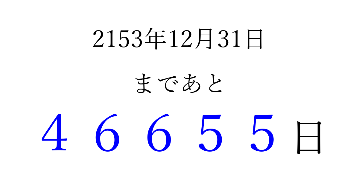 2153年12月31日(月)まで あと 99999 日です 追加すると、トップページからすぐ選べるようになります ※2026/04/06現在の結果です。 最新の状態に更新する ↓シェアして、タイムライン上にカウントダウンを表示しよう!↓ 📤 この結果を共有する Tweet シェア Threads Bluesky 別の日付でカウントダウン 2153年12月のカレンダー このページをブックマークに追加すると、いつでもカウントダウンを確認できます。 (PC: Ctrl+D / Mac: ⌘+D) hitome-notes.comでは以下のページも運営しています。 指定日と期間から日付を計算 | ガチャ確率計算・シミュレーション | プライバシー・ポリシー 運営者:Avocado