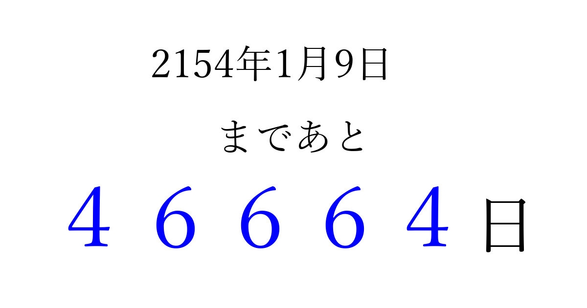 2154年1月9日(水)まで あと 99999 日です 追加すると、トップページからすぐ選べるようになります ※2026/04/06現在の結果です。 最新の状態に更新する ↓シェアして、タイムライン上にカウントダウンを表示しよう!↓ 📤 この結果を共有する Tweet シェア Threads Bluesky 別の日付でカウントダウン 2154年1月のカレンダー このページをブックマークに追加すると、いつでもカウントダウンを確認できます。 (PC: Ctrl+D / Mac: ⌘+D) hitome-notes.comでは以下のページも運営しています。 指定日と期間から日付を計算 | ガチャ確率計算・シミュレーション | プライバシー・ポリシー 運営者:Avocado