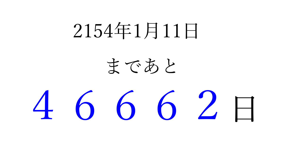 2154年1月11日(金)まで あと 99999 日です 追加すると、トップページからすぐ選べるようになります ※2026/04/10現在の結果です。 最新の状態に更新する ↓シェアして、タイムライン上にカウントダウンを表示しよう!↓ 📤 この結果を共有する Tweet シェア Threads Bluesky 別の日付でカウントダウン 2154年1月のカレンダー このページをブックマークに追加すると、いつでもカウントダウンを確認できます。 (PC: Ctrl+D / Mac: ⌘+D) hitome-notes.comでは以下のページも運営しています。 指定日と期間から日付を計算 | ガチャ確率計算・シミュレーション | プライバシー・ポリシー 運営者:Avocado
