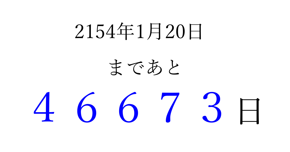 2154年1月20日(日)まで あと 99999 日です 追加すると、トップページからすぐ選べるようになります ※2026/04/08現在の結果です。 最新の状態に更新する ↓シェアして、タイムライン上にカウントダウンを表示しよう!↓ 📤 この結果を共有する Tweet シェア Threads Bluesky 別の日付でカウントダウン 2154年1月のカレンダー このページをブックマークに追加すると、いつでもカウントダウンを確認できます。 (PC: Ctrl+D / Mac: ⌘+D) hitome-notes.comでは以下のページも運営しています。 指定日と期間から日付を計算 | ガチャ確率計算・シミュレーション | プライバシー・ポリシー 運営者:Avocado