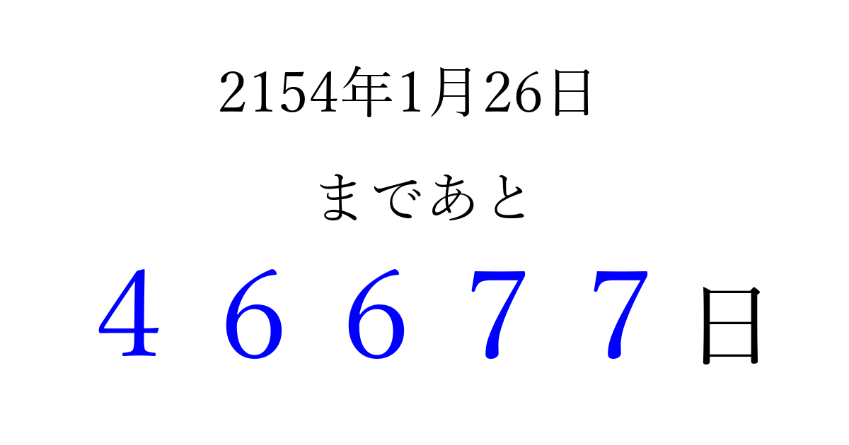 2154年1月26日(土)まで あと 99999 日です 追加すると、トップページからすぐ選べるようになります ※2026/04/10現在の結果です。 最新の状態に更新する ↓シェアして、タイムライン上にカウントダウンを表示しよう!↓ 📤 この結果を共有する Tweet シェア Threads Bluesky 別の日付でカウントダウン 2154年1月のカレンダー このページをブックマークに追加すると、いつでもカウントダウンを確認できます。 (PC: Ctrl+D / Mac: ⌘+D) hitome-notes.comでは以下のページも運営しています。 指定日と期間から日付を計算 | ガチャ確率計算・シミュレーション | プライバシー・ポリシー 運営者:Avocado