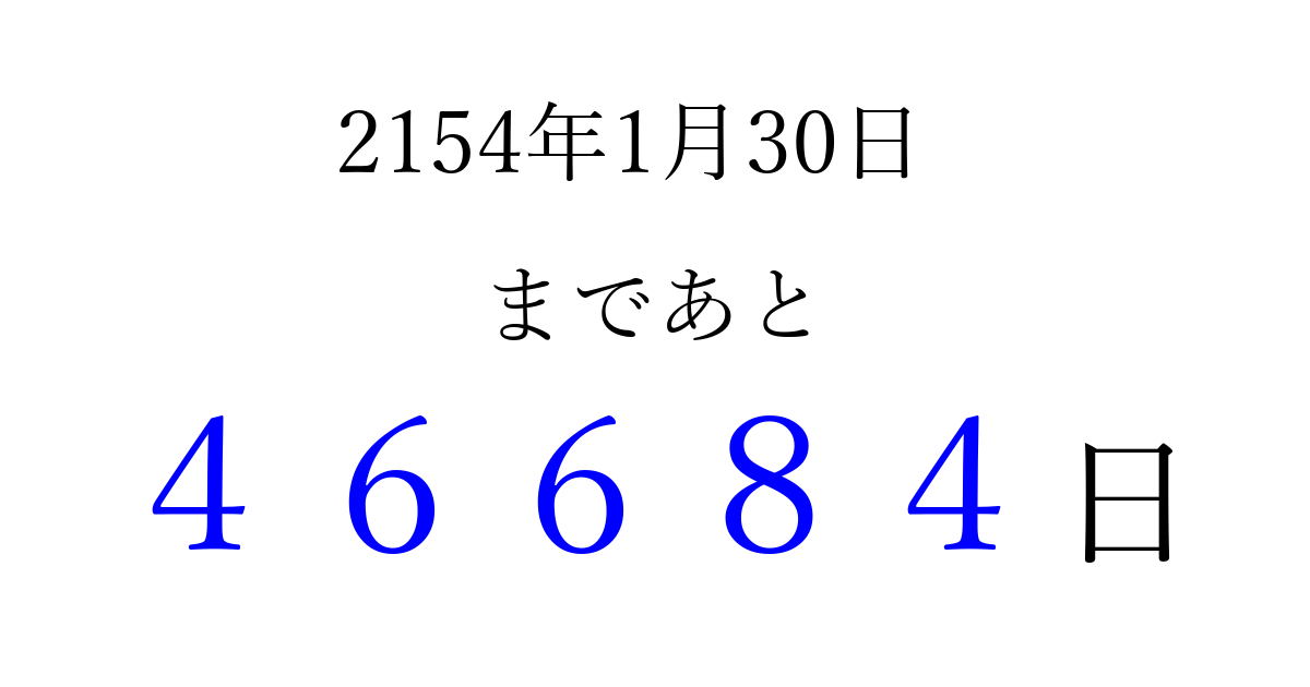2154年1月30日(水)まで あと 99999 日です 追加すると、トップページからすぐ選べるようになります ※2026/04/07現在の結果です。 最新の状態に更新する ↓シェアして、タイムライン上にカウントダウンを表示しよう!↓ 📤 この結果を共有する Tweet シェア Threads Bluesky 別の日付でカウントダウン 2154年1月のカレンダー このページをブックマークに追加すると、いつでもカウントダウンを確認できます。 (PC: Ctrl+D / Mac: ⌘+D) hitome-notes.comでは以下のページも運営しています。 指定日と期間から日付を計算 | ガチャ確率計算・シミュレーション | プライバシー・ポリシー 運営者:Avocado
