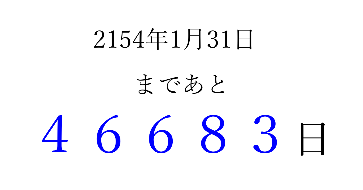 2154年1月31日(木)まで あと 99999 日です 追加すると、トップページからすぐ選べるようになります ※2026/04/09現在の結果です。 最新の状態に更新する ↓シェアして、タイムライン上にカウントダウンを表示しよう!↓ 📤 この結果を共有する Tweet シェア Threads Bluesky 別の日付でカウントダウン 2154年1月のカレンダー このページをブックマークに追加すると、いつでもカウントダウンを確認できます。 (PC: Ctrl+D / Mac: ⌘+D) hitome-notes.comでは以下のページも運営しています。 指定日と期間から日付を計算 | ガチャ確率計算・シミュレーション | プライバシー・ポリシー 運営者:Avocado