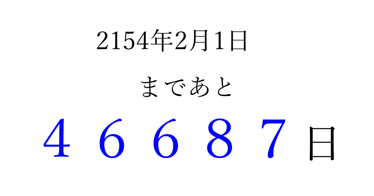 2154年2月1日(金)まで あと 99999 日です 追加すると、トップページからすぐ選べるようになります ※2026/04/06現在の結果です。 最新の状態に更新する ↓シェアして、タイムライン上にカウントダウンを表示しよう!↓ 📤 この結果を共有する Tweet シェア Threads Bluesky 別の日付でカウントダウン 2154年2月のカレンダー このページをブックマークに追加すると、いつでもカウントダウンを確認できます。 (PC: Ctrl+D / Mac: ⌘+D) hitome-notes.comでは以下のページも運営しています。 指定日と期間から日付を計算 | ガチャ確率計算・シミュレーション | プライバシー・ポリシー 運営者:Avocado