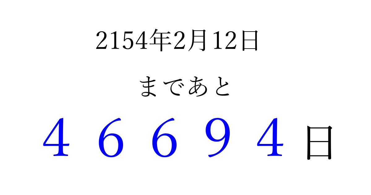 2154年2月12日(火)まで あと 99999 日です 追加すると、トップページからすぐ選べるようになります ※2026/04/10現在の結果です。 最新の状態に更新する ↓シェアして、タイムライン上にカウントダウンを表示しよう!↓ 📤 この結果を共有する Tweet シェア Threads Bluesky 別の日付でカウントダウン 2154年2月のカレンダー このページをブックマークに追加すると、いつでもカウントダウンを確認できます。 (PC: Ctrl+D / Mac: ⌘+D) hitome-notes.comでは以下のページも運営しています。 指定日と期間から日付を計算 | ガチャ確率計算・シミュレーション | プライバシー・ポリシー 運営者:Avocado