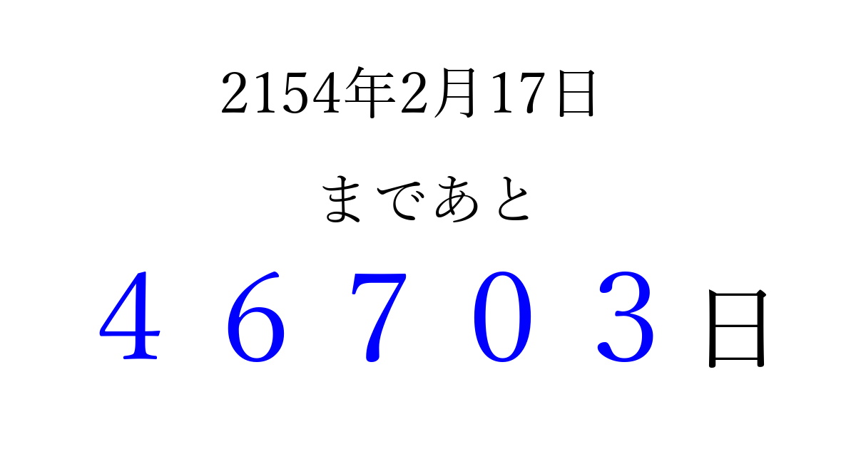 2154年2月17日(日)まで あと 99999 日です 追加すると、トップページからすぐ選べるようになります ※2026/04/06現在の結果です。 最新の状態に更新する ↓シェアして、タイムライン上にカウントダウンを表示しよう!↓ 📤 この結果を共有する Tweet シェア Threads Bluesky 別の日付でカウントダウン 2154年2月のカレンダー このページをブックマークに追加すると、いつでもカウントダウンを確認できます。 (PC: Ctrl+D / Mac: ⌘+D) hitome-notes.comでは以下のページも運営しています。 指定日と期間から日付を計算 | ガチャ確率計算・シミュレーション | プライバシー・ポリシー 運営者:Avocado