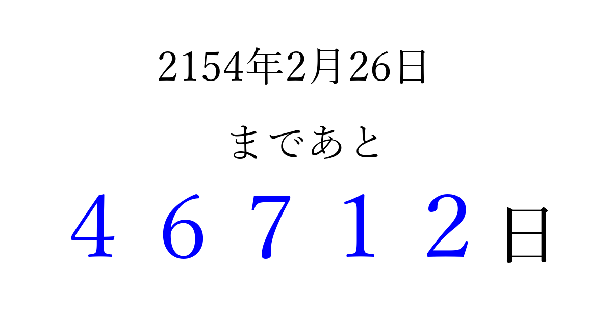 2154年2月26日(火)まで あと 99999 日です 追加すると、トップページからすぐ選べるようになります ※2026/04/06現在の結果です。 最新の状態に更新する ↓シェアして、タイムライン上にカウントダウンを表示しよう!↓ 📤 この結果を共有する Tweet シェア Threads Bluesky 別の日付でカウントダウン 2154年2月のカレンダー このページをブックマークに追加すると、いつでもカウントダウンを確認できます。 (PC: Ctrl+D / Mac: ⌘+D) hitome-notes.comでは以下のページも運営しています。 指定日と期間から日付を計算 | ガチャ確率計算・シミュレーション | プライバシー・ポリシー 運営者:Avocado