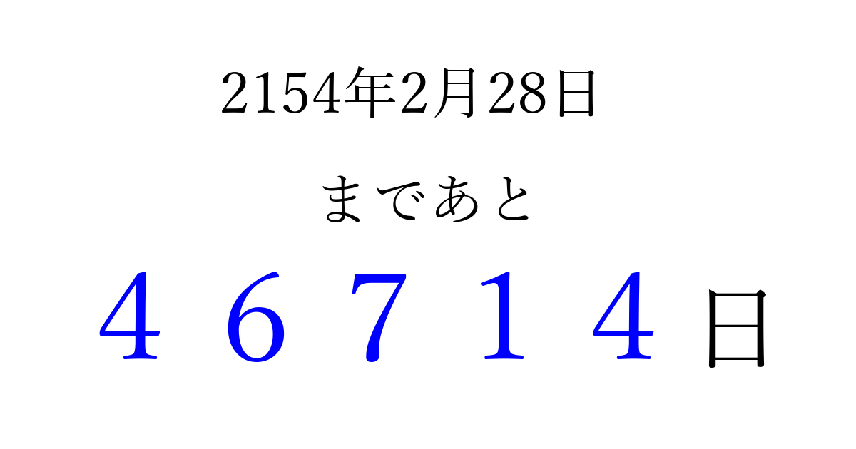 2154年2月28日(木)まで あと 99999 日です 追加すると、トップページからすぐ選べるようになります ※2026/04/06現在の結果です。 最新の状態に更新する ↓シェアして、タイムライン上にカウントダウンを表示しよう!↓ 📤 この結果を共有する Tweet シェア Threads Bluesky 別の日付でカウントダウン 2154年2月のカレンダー このページをブックマークに追加すると、いつでもカウントダウンを確認できます。 (PC: Ctrl+D / Mac: ⌘+D) hitome-notes.comでは以下のページも運営しています。 指定日と期間から日付を計算 | ガチャ確率計算・シミュレーション | プライバシー・ポリシー 運営者:Avocado