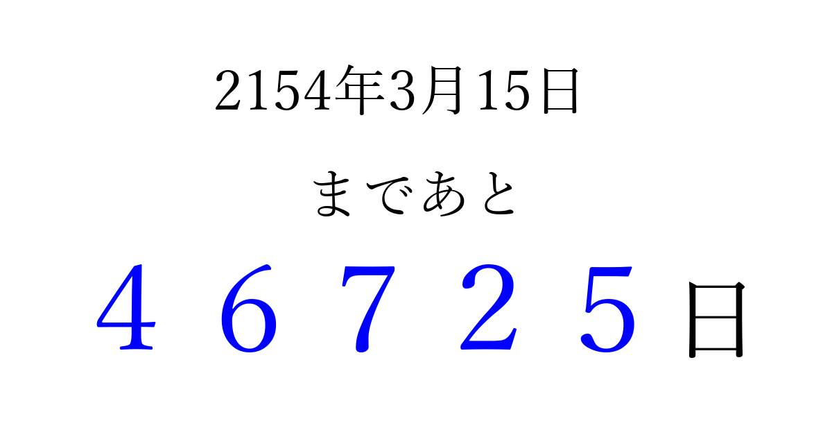 2154年3月15日(金)まで あと 99999 日です 追加すると、トップページからすぐ選べるようになります ※2026/04/10現在の結果です。 最新の状態に更新する ↓シェアして、タイムライン上にカウントダウンを表示しよう!↓ 📤 この結果を共有する Tweet シェア Threads Bluesky 別の日付でカウントダウン 2154年3月のカレンダー このページをブックマークに追加すると、いつでもカウントダウンを確認できます。 (PC: Ctrl+D / Mac: ⌘+D) hitome-notes.comでは以下のページも運営しています。 指定日と期間から日付を計算 | ガチャ確率計算・シミュレーション | プライバシー・ポリシー 運営者:Avocado