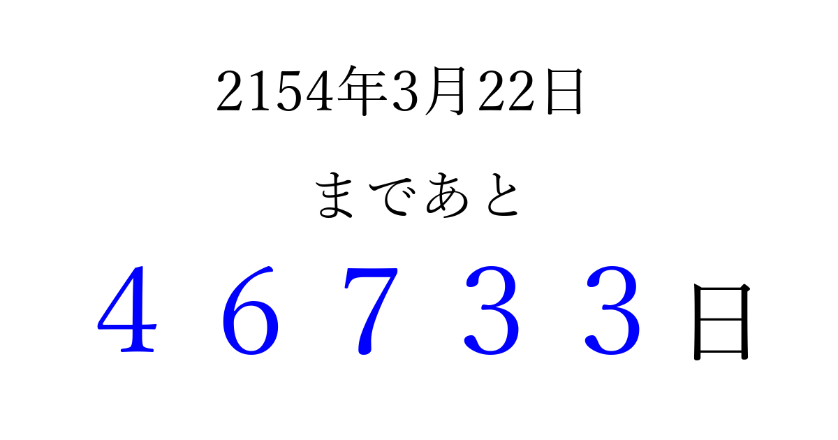 2154年3月22日(金)まで あと 99999 日です 追加すると、トップページからすぐ選べるようになります ※2026/04/09現在の結果です。 最新の状態に更新する ↓シェアして、タイムライン上にカウントダウンを表示しよう!↓ 📤 この結果を共有する Tweet シェア Threads Bluesky 別の日付でカウントダウン 2154年3月のカレンダー このページをブックマークに追加すると、いつでもカウントダウンを確認できます。 (PC: Ctrl+D / Mac: ⌘+D) hitome-notes.comでは以下のページも運営しています。 指定日と期間から日付を計算 | ガチャ確率計算・シミュレーション | プライバシー・ポリシー 運営者:Avocado