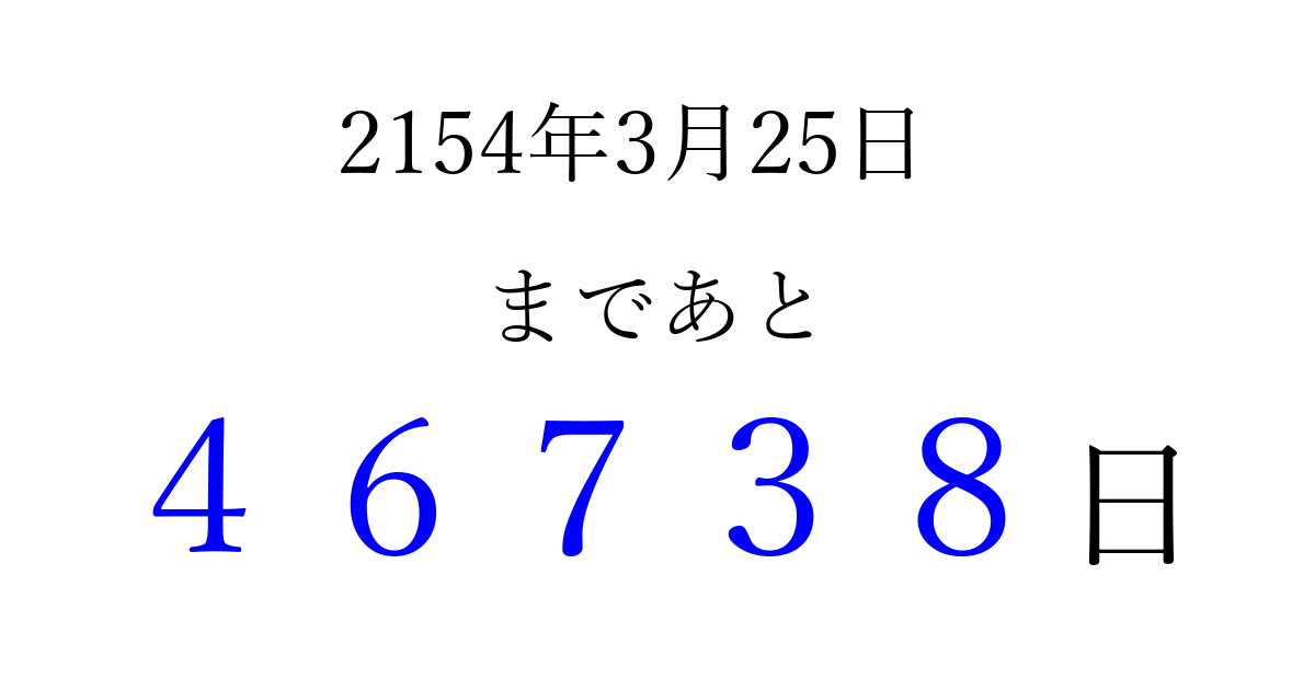 2154年3月25日(月)まで あと 99999 日です 追加すると、トップページからすぐ選べるようになります ※2026/04/07現在の結果です。 最新の状態に更新する ↓シェアして、タイムライン上にカウントダウンを表示しよう!↓ 📤 この結果を共有する Tweet シェア Threads Bluesky 別の日付でカウントダウン 2154年3月のカレンダー このページをブックマークに追加すると、いつでもカウントダウンを確認できます。 (PC: Ctrl+D / Mac: ⌘+D) hitome-notes.comでは以下のページも運営しています。 指定日と期間から日付を計算 | ガチャ確率計算・シミュレーション | プライバシー・ポリシー 運営者:Avocado
