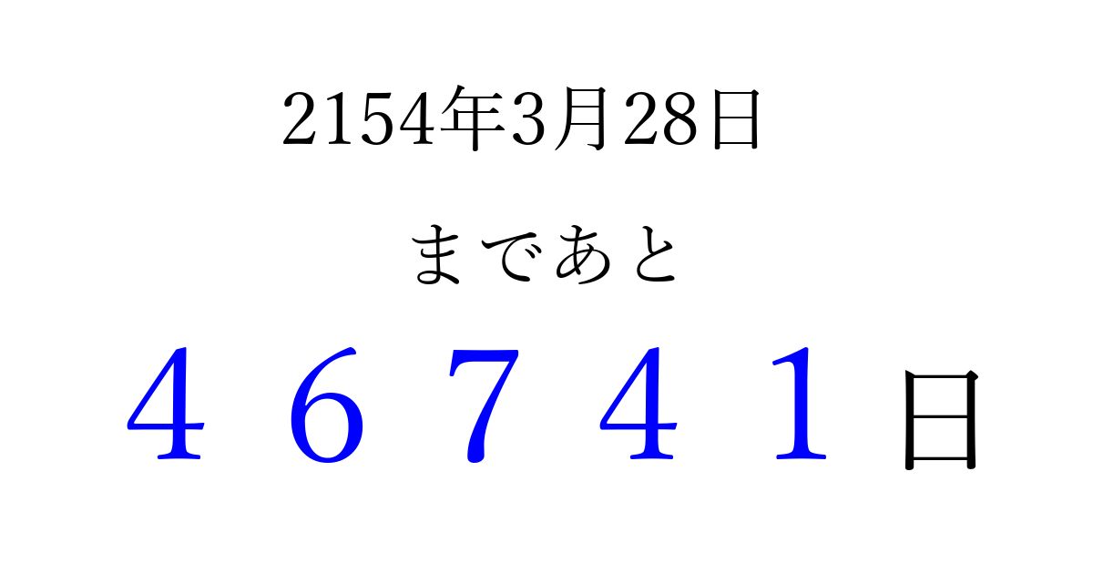 2154年3月28日(木)まで あと 99999 日です 追加すると、トップページからすぐ選べるようになります ※2026/04/07現在の結果です。 最新の状態に更新する ↓シェアして、タイムライン上にカウントダウンを表示しよう!↓ 📤 この結果を共有する Tweet シェア Threads Bluesky 別の日付でカウントダウン 2154年3月のカレンダー このページをブックマークに追加すると、いつでもカウントダウンを確認できます。 (PC: Ctrl+D / Mac: ⌘+D) hitome-notes.comでは以下のページも運営しています。 指定日と期間から日付を計算 | ガチャ確率計算・シミュレーション | プライバシー・ポリシー 運営者:Avocado