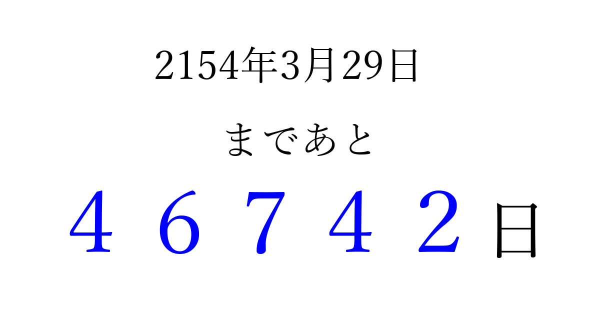 2154年3月29日(金)まで あと 99999 日です 追加すると、トップページからすぐ選べるようになります ※2026/04/07現在の結果です。 最新の状態に更新する ↓シェアして、タイムライン上にカウントダウンを表示しよう!↓ 📤 この結果を共有する Tweet シェア Threads Bluesky 別の日付でカウントダウン 2154年3月のカレンダー このページをブックマークに追加すると、いつでもカウントダウンを確認できます。 (PC: Ctrl+D / Mac: ⌘+D) hitome-notes.comでは以下のページも運営しています。 指定日と期間から日付を計算 | ガチャ確率計算・シミュレーション | プライバシー・ポリシー 運営者:Avocado
