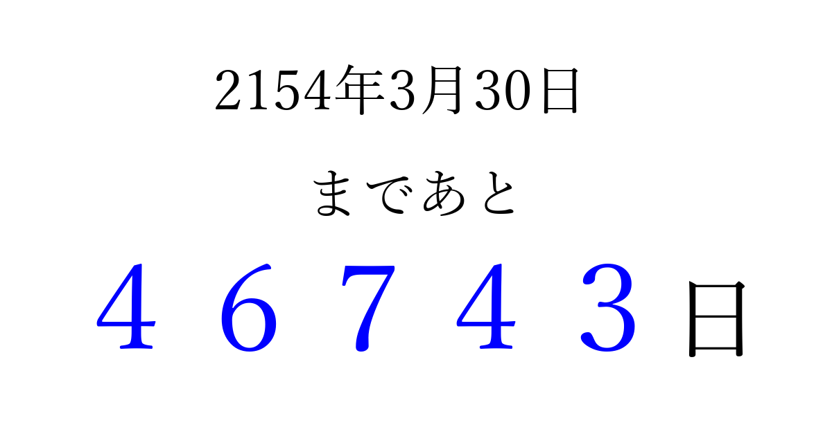 2154年3月30日(土)まで あと 99999 日です 追加すると、トップページからすぐ選べるようになります ※2026/04/07現在の結果です。 最新の状態に更新する ↓シェアして、タイムライン上にカウントダウンを表示しよう!↓ 📤 この結果を共有する Tweet シェア Threads Bluesky 別の日付でカウントダウン 2154年3月のカレンダー このページをブックマークに追加すると、いつでもカウントダウンを確認できます。 (PC: Ctrl+D / Mac: ⌘+D) hitome-notes.comでは以下のページも運営しています。 指定日と期間から日付を計算 | ガチャ確率計算・シミュレーション | プライバシー・ポリシー 運営者:Avocado