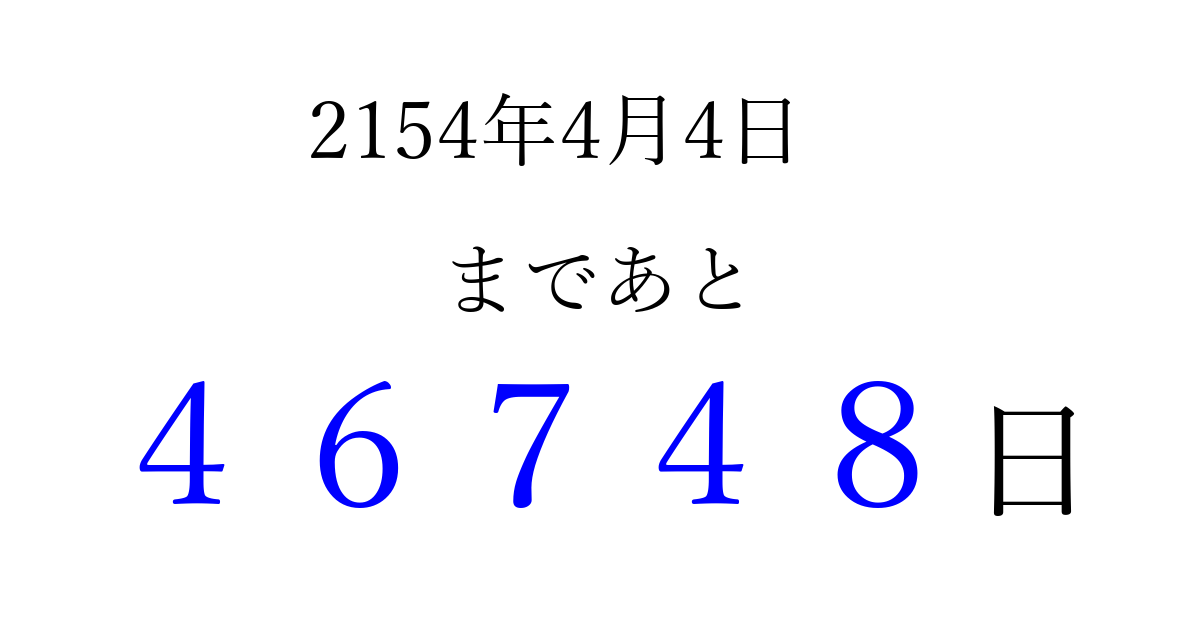 2154年4月4日(木)まで あと 99999 日です 追加すると、トップページからすぐ選べるようになります ※2026/04/07現在の結果です。 最新の状態に更新する ↓シェアして、タイムライン上にカウントダウンを表示しよう!↓ 📤 この結果を共有する Tweet シェア Threads Bluesky 別の日付でカウントダウン 2154年4月のカレンダー このページをブックマークに追加すると、いつでもカウントダウンを確認できます。 (PC: Ctrl+D / Mac: ⌘+D) hitome-notes.comでは以下のページも運営しています。 指定日と期間から日付を計算 | ガチャ確率計算・シミュレーション | プライバシー・ポリシー 運営者:Avocado
