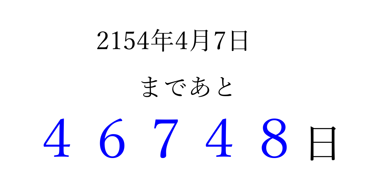2154年4月7日(日)まで あと 99999 日です 追加すると、トップページからすぐ選べるようになります ※2026/04/10現在の結果です。 最新の状態に更新する ↓シェアして、タイムライン上にカウントダウンを表示しよう!↓ 📤 この結果を共有する Tweet シェア Threads Bluesky 別の日付でカウントダウン 2154年4月のカレンダー このページをブックマークに追加すると、いつでもカウントダウンを確認できます。 (PC: Ctrl+D / Mac: ⌘+D) hitome-notes.comでは以下のページも運営しています。 指定日と期間から日付を計算 | ガチャ確率計算・シミュレーション | プライバシー・ポリシー 運営者:Avocado