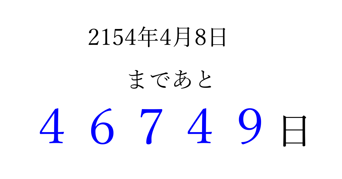 2154年4月8日(月)まで あと 99999 日です 追加すると、トップページからすぐ選べるようになります ※2026/04/10現在の結果です。 最新の状態に更新する ↓シェアして、タイムライン上にカウントダウンを表示しよう!↓ 📤 この結果を共有する Tweet シェア Threads Bluesky 別の日付でカウントダウン 2154年4月のカレンダー このページをブックマークに追加すると、いつでもカウントダウンを確認できます。 (PC: Ctrl+D / Mac: ⌘+D) hitome-notes.comでは以下のページも運営しています。 指定日と期間から日付を計算 | ガチャ確率計算・シミュレーション | プライバシー・ポリシー 運営者:Avocado