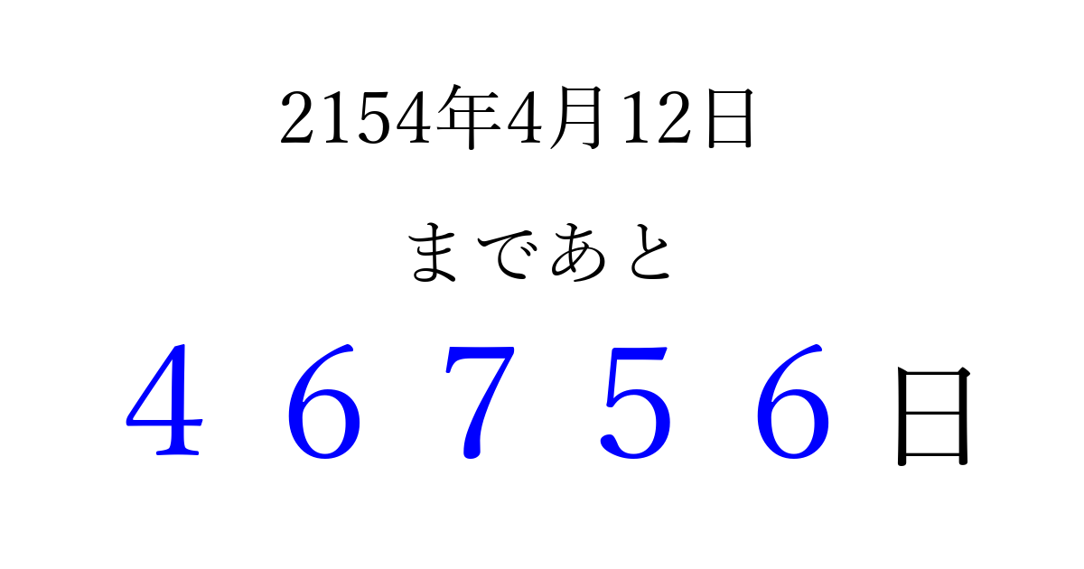 2154年4月12日(金)まで あと 99999 日です 追加すると、トップページからすぐ選べるようになります ※2026/04/07現在の結果です。 最新の状態に更新する ↓シェアして、タイムライン上にカウントダウンを表示しよう!↓ 📤 この結果を共有する Tweet シェア Threads Bluesky 別の日付でカウントダウン 2154年4月のカレンダー このページをブックマークに追加すると、いつでもカウントダウンを確認できます。 (PC: Ctrl+D / Mac: ⌘+D) hitome-notes.comでは以下のページも運営しています。 指定日と期間から日付を計算 | ガチャ確率計算・シミュレーション | プライバシー・ポリシー 運営者:Avocado