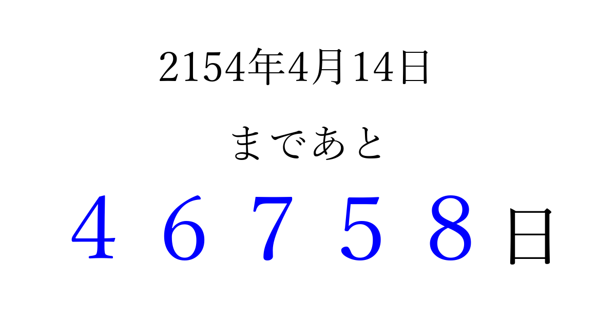 2154年4月14日(日)まで あと 99999 日です 追加すると、トップページからすぐ選べるようになります ※2026/04/07現在の結果です。 最新の状態に更新する ↓シェアして、タイムライン上にカウントダウンを表示しよう!↓ 📤 この結果を共有する Tweet シェア Threads Bluesky 別の日付でカウントダウン 2154年4月のカレンダー このページをブックマークに追加すると、いつでもカウントダウンを確認できます。 (PC: Ctrl+D / Mac: ⌘+D) hitome-notes.comでは以下のページも運営しています。 指定日と期間から日付を計算 | ガチャ確率計算・シミュレーション | プライバシー・ポリシー 運営者:Avocado