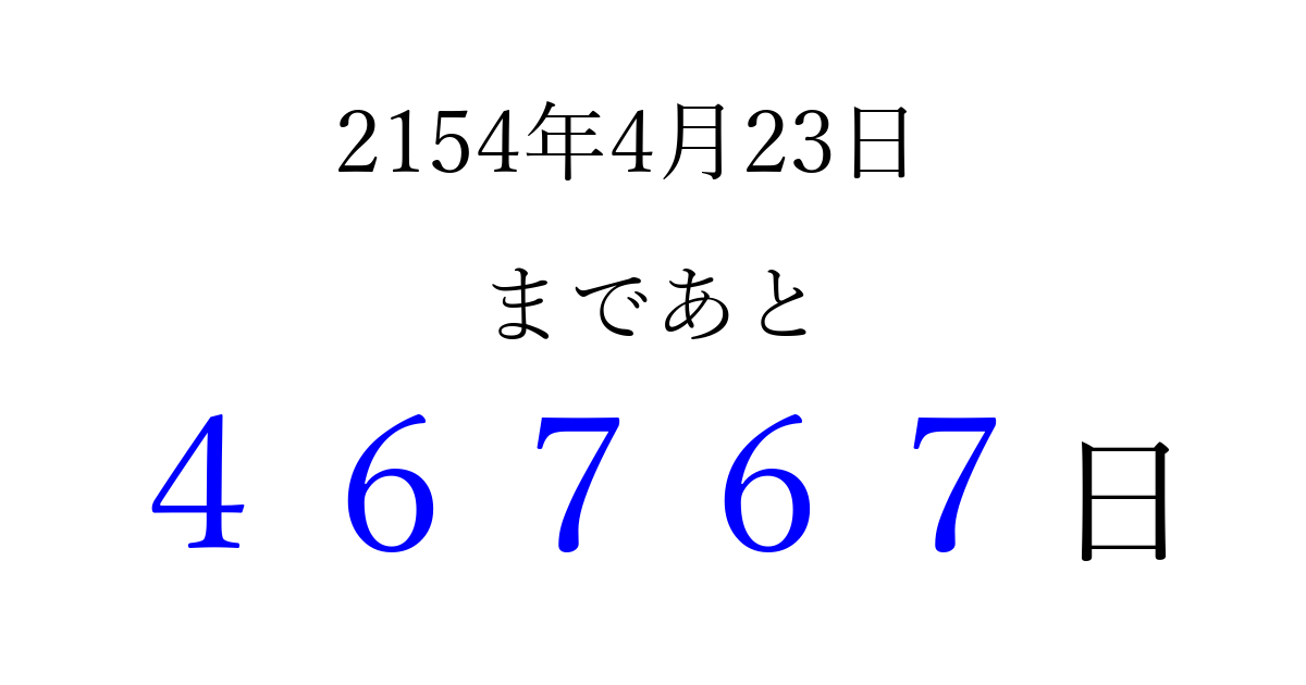 2154年4月23日(火)まで あと 99999 日です 追加すると、トップページからすぐ選べるようになります ※2026/04/07現在の結果です。 最新の状態に更新する ↓シェアして、タイムライン上にカウントダウンを表示しよう!↓ 📤 この結果を共有する Tweet シェア Threads Bluesky 別の日付でカウントダウン 2154年4月のカレンダー このページをブックマークに追加すると、いつでもカウントダウンを確認できます。 (PC: Ctrl+D / Mac: ⌘+D) hitome-notes.comでは以下のページも運営しています。 指定日と期間から日付を計算 | ガチャ確率計算・シミュレーション | プライバシー・ポリシー 運営者:Avocado