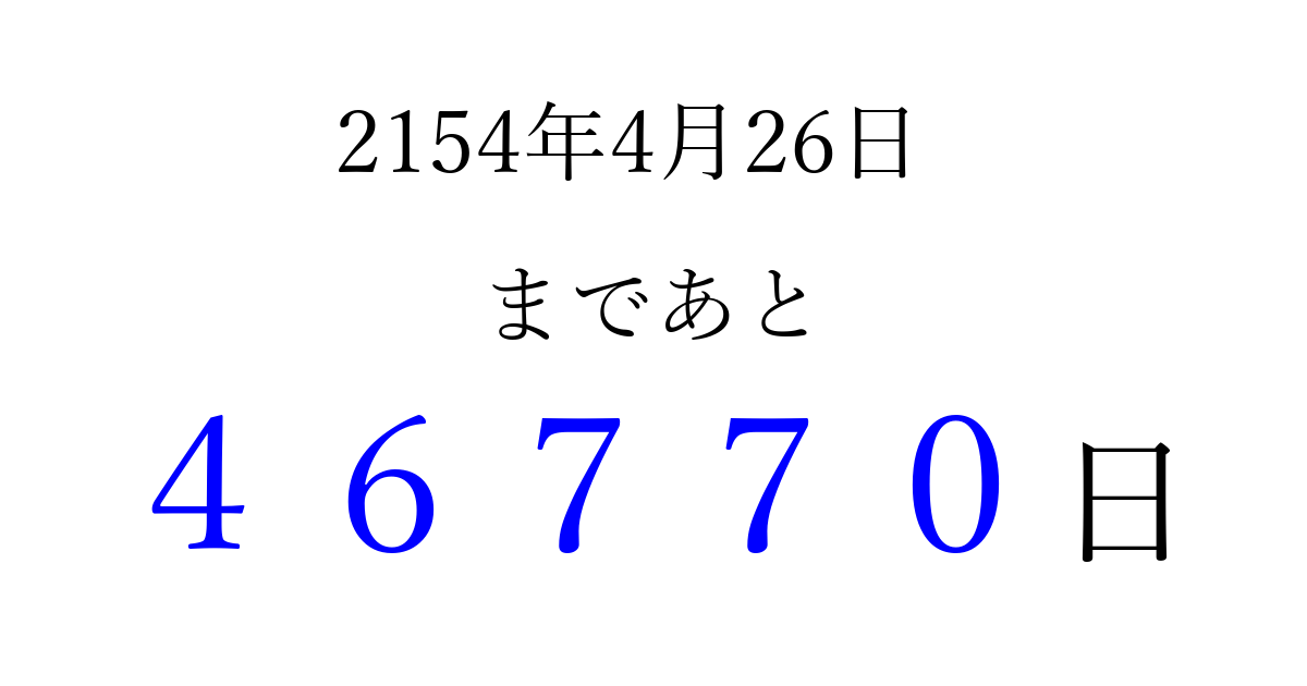 2154年4月26日(金)まで あと 99999 日です 追加すると、トップページからすぐ選べるようになります ※2026/04/07現在の結果です。 最新の状態に更新する ↓シェアして、タイムライン上にカウントダウンを表示しよう!↓ 📤 この結果を共有する Tweet シェア Threads Bluesky 別の日付でカウントダウン 2154年4月のカレンダー このページをブックマークに追加すると、いつでもカウントダウンを確認できます。 (PC: Ctrl+D / Mac: ⌘+D) hitome-notes.comでは以下のページも運営しています。 指定日と期間から日付を計算 | ガチャ確率計算・シミュレーション | プライバシー・ポリシー 運営者:Avocado