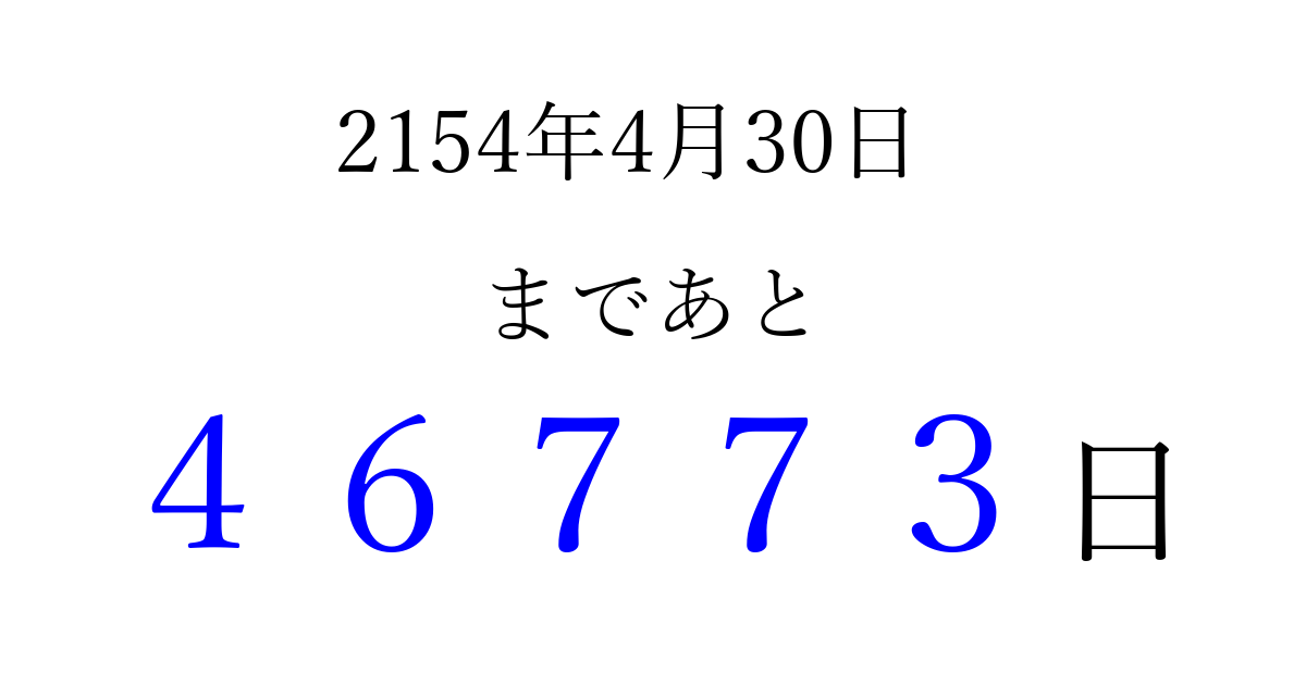 2154年4月30日(火)まで あと 99999 日です 追加すると、トップページからすぐ選べるようになります ※2026/04/08現在の結果です。 最新の状態に更新する ↓シェアして、タイムライン上にカウントダウンを表示しよう!↓ 📤 この結果を共有する Tweet シェア Threads Bluesky 別の日付でカウントダウン 2154年4月のカレンダー このページをブックマークに追加すると、いつでもカウントダウンを確認できます。 (PC: Ctrl+D / Mac: ⌘+D) hitome-notes.comでは以下のページも運営しています。 指定日と期間から日付を計算 | ガチャ確率計算・シミュレーション | プライバシー・ポリシー 運営者:Avocado