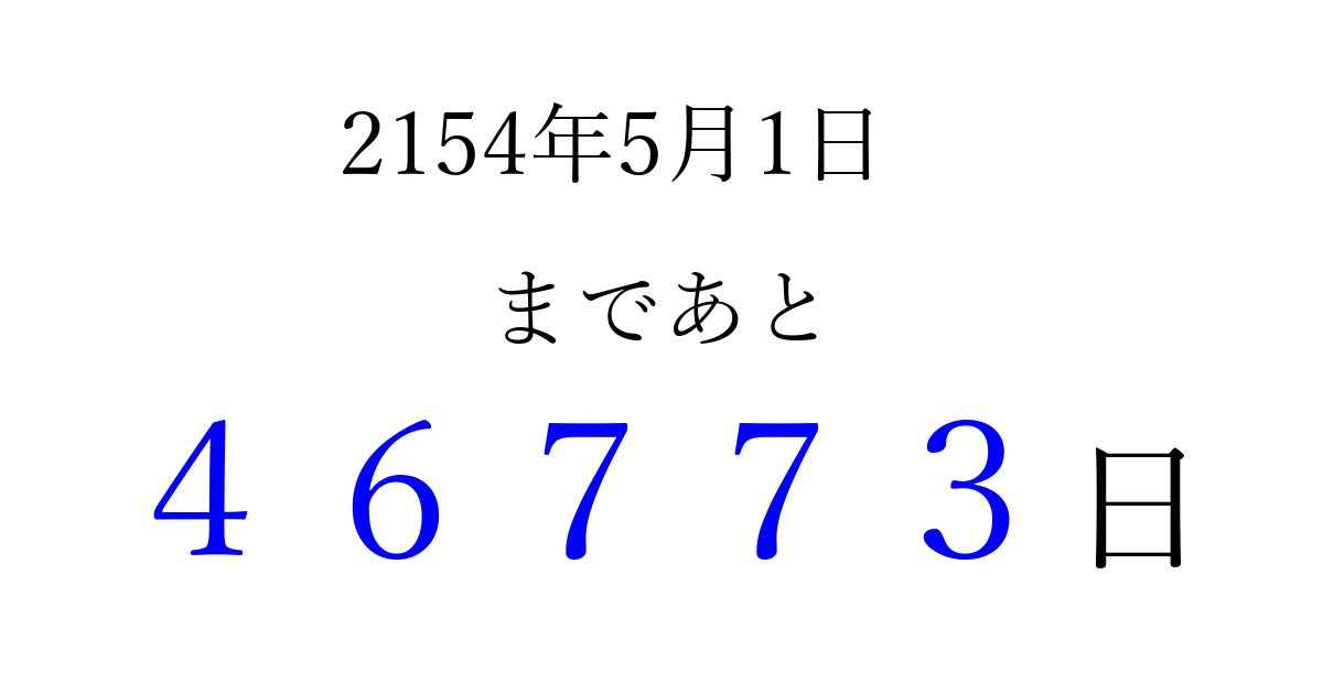 2154年5月1日(水)まで あと 99999 日です 追加すると、トップページからすぐ選べるようになります ※2026/04/09現在の結果です。 最新の状態に更新する ↓シェアして、タイムライン上にカウントダウンを表示しよう!↓ 📤 この結果を共有する Tweet シェア Threads Bluesky 別の日付でカウントダウン 2154年5月のカレンダー このページをブックマークに追加すると、いつでもカウントダウンを確認できます。 (PC: Ctrl+D / Mac: ⌘+D) hitome-notes.comでは以下のページも運営しています。 指定日と期間から日付を計算 | ガチャ確率計算・シミュレーション | プライバシー・ポリシー 運営者:Avocado
