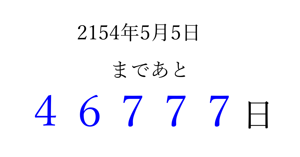 2154年5月5日(日)まで あと 99999 日です 追加すると、トップページからすぐ選べるようになります ※2026/04/09現在の結果です。 最新の状態に更新する ↓シェアして、タイムライン上にカウントダウンを表示しよう!↓ 📤 この結果を共有する Tweet シェア Threads Bluesky 別の日付でカウントダウン 2154年5月のカレンダー このページをブックマークに追加すると、いつでもカウントダウンを確認できます。 (PC: Ctrl+D / Mac: ⌘+D) hitome-notes.comでは以下のページも運営しています。 指定日と期間から日付を計算 | ガチャ確率計算・シミュレーション | プライバシー・ポリシー 運営者:Avocado