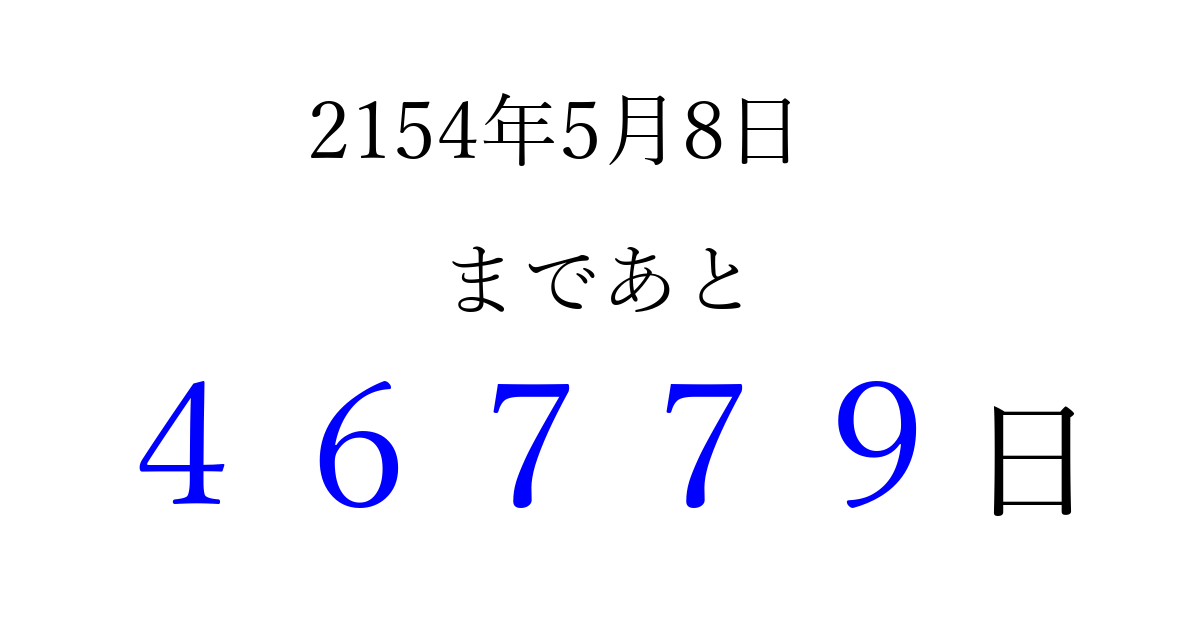 2154年5月8日(水)まで あと 99999 日です 追加すると、トップページからすぐ選べるようになります ※2026/04/10現在の結果です。 最新の状態に更新する ↓シェアして、タイムライン上にカウントダウンを表示しよう!↓ 📤 この結果を共有する Tweet シェア Threads Bluesky 別の日付でカウントダウン 2154年5月のカレンダー このページをブックマークに追加すると、いつでもカウントダウンを確認できます。 (PC: Ctrl+D / Mac: ⌘+D) hitome-notes.comでは以下のページも運営しています。 指定日と期間から日付を計算 | ガチャ確率計算・シミュレーション | プライバシー・ポリシー 運営者:Avocado