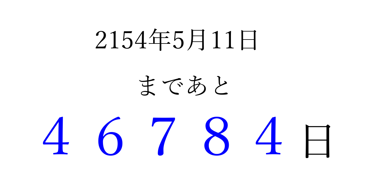 2154年5月11日(土)まで あと 99999 日です 追加すると、トップページからすぐ選べるようになります ※2026/04/08現在の結果です。 最新の状態に更新する ↓シェアして、タイムライン上にカウントダウンを表示しよう!↓ 📤 この結果を共有する Tweet シェア Threads Bluesky 別の日付でカウントダウン 2154年5月のカレンダー このページをブックマークに追加すると、いつでもカウントダウンを確認できます。 (PC: Ctrl+D / Mac: ⌘+D) hitome-notes.comでは以下のページも運営しています。 指定日と期間から日付を計算 | ガチャ確率計算・シミュレーション | プライバシー・ポリシー 運営者:Avocado