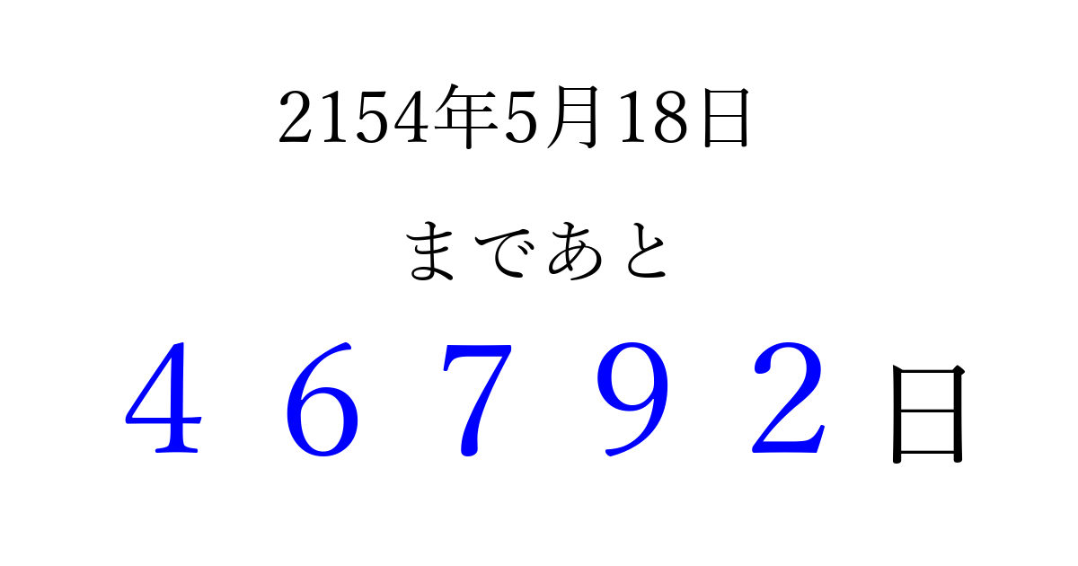 2154年5月18日(土)まで あと 99999 日です 追加すると、トップページからすぐ選べるようになります ※2026/04/07現在の結果です。 最新の状態に更新する ↓シェアして、タイムライン上にカウントダウンを表示しよう!↓ 📤 この結果を共有する Tweet シェア Threads Bluesky 別の日付でカウントダウン 2154年5月のカレンダー このページをブックマークに追加すると、いつでもカウントダウンを確認できます。 (PC: Ctrl+D / Mac: ⌘+D) hitome-notes.comでは以下のページも運営しています。 指定日と期間から日付を計算 | ガチャ確率計算・シミュレーション | プライバシー・ポリシー 運営者:Avocado