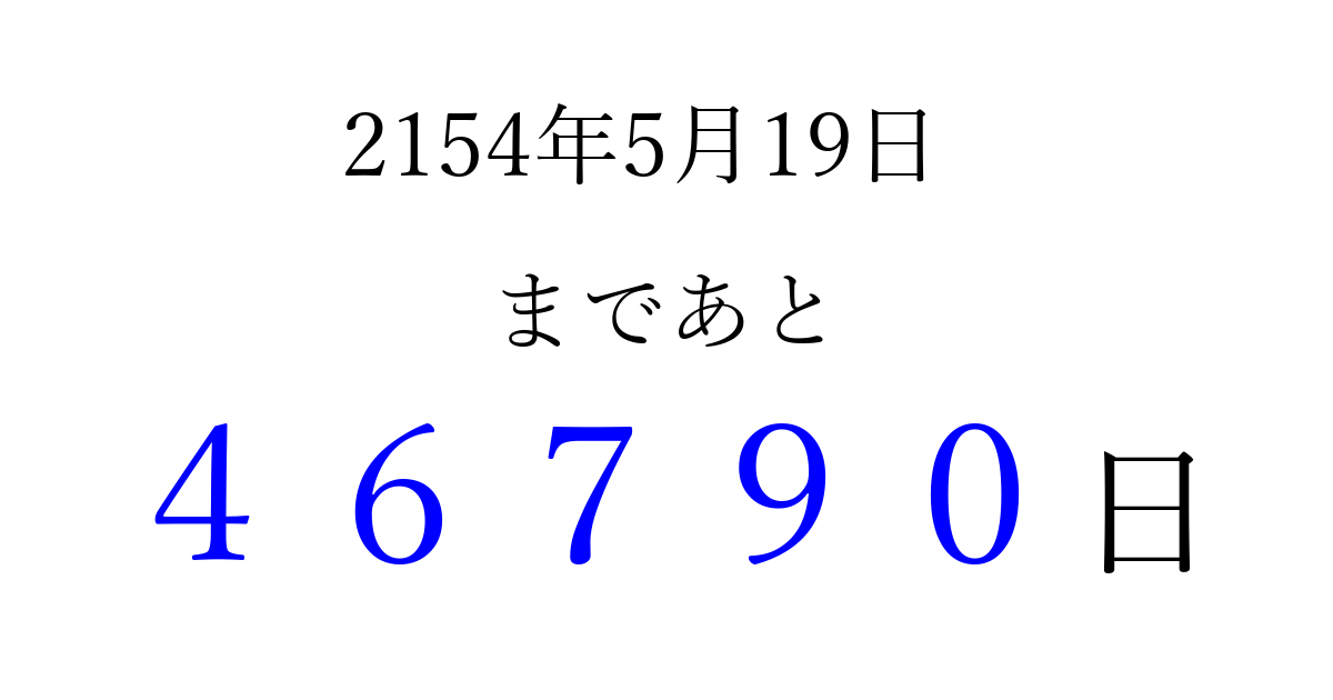 2154年5月19日(日)まで あと 99999 日です 追加すると、トップページからすぐ選べるようになります ※2026/04/10現在の結果です。 最新の状態に更新する ↓シェアして、タイムライン上にカウントダウンを表示しよう!↓ 📤 この結果を共有する Tweet シェア Threads Bluesky 別の日付でカウントダウン 2154年5月のカレンダー このページをブックマークに追加すると、いつでもカウントダウンを確認できます。 (PC: Ctrl+D / Mac: ⌘+D) hitome-notes.comでは以下のページも運営しています。 指定日と期間から日付を計算 | ガチャ確率計算・シミュレーション | プライバシー・ポリシー 運営者:Avocado