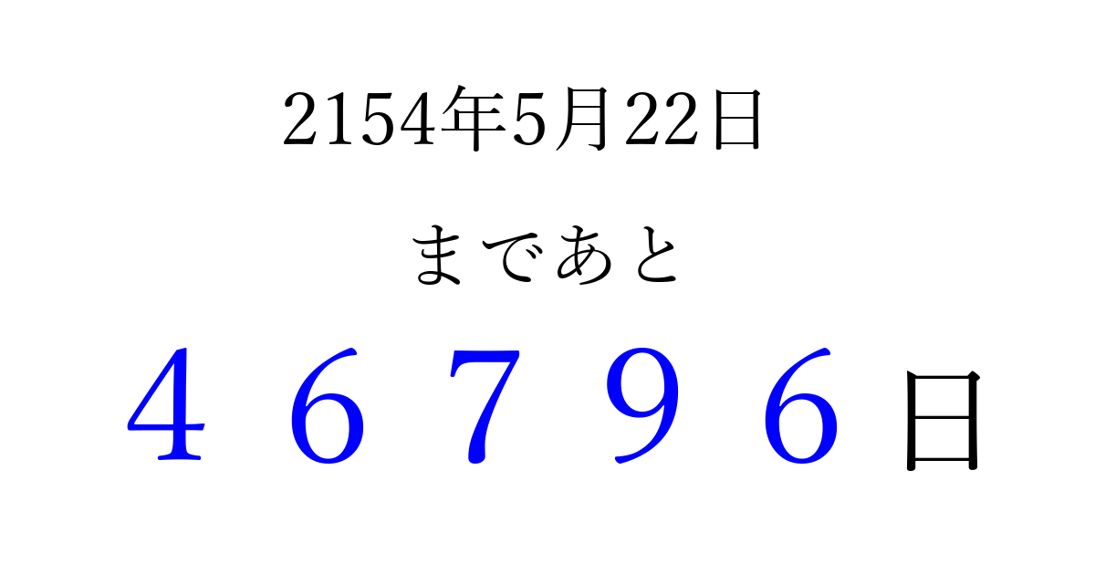 2154年5月22日(水)まで あと 99999 日です 追加すると、トップページからすぐ選べるようになります ※2026/04/07現在の結果です。 最新の状態に更新する ↓シェアして、タイムライン上にカウントダウンを表示しよう!↓ 📤 この結果を共有する Tweet シェア Threads Bluesky 別の日付でカウントダウン 2154年5月のカレンダー このページをブックマークに追加すると、いつでもカウントダウンを確認できます。 (PC: Ctrl+D / Mac: ⌘+D) hitome-notes.comでは以下のページも運営しています。 指定日と期間から日付を計算 | ガチャ確率計算・シミュレーション | プライバシー・ポリシー 運営者:Avocado