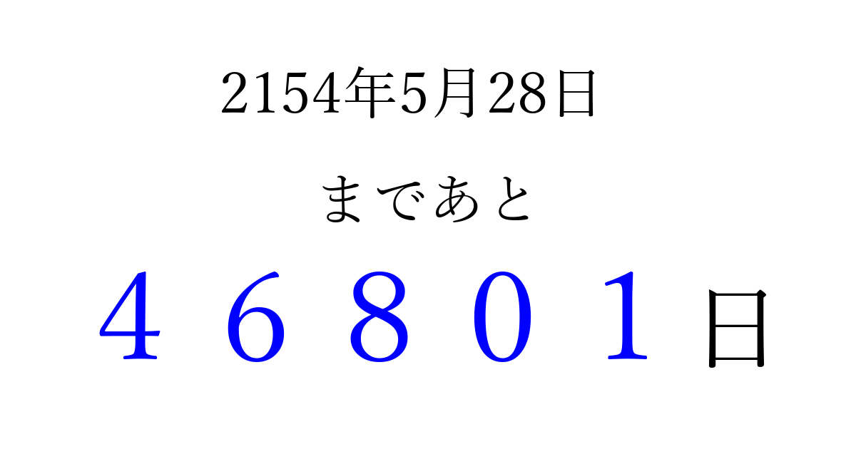 2154年5月28日(火)まで あと 99999 日です 追加すると、トップページからすぐ選べるようになります ※2026/04/08現在の結果です。 最新の状態に更新する ↓シェアして、タイムライン上にカウントダウンを表示しよう!↓ 📤 この結果を共有する Tweet シェア Threads Bluesky 別の日付でカウントダウン 2154年5月のカレンダー このページをブックマークに追加すると、いつでもカウントダウンを確認できます。 (PC: Ctrl+D / Mac: ⌘+D) hitome-notes.comでは以下のページも運営しています。 指定日と期間から日付を計算 | ガチャ確率計算・シミュレーション | プライバシー・ポリシー 運営者:Avocado