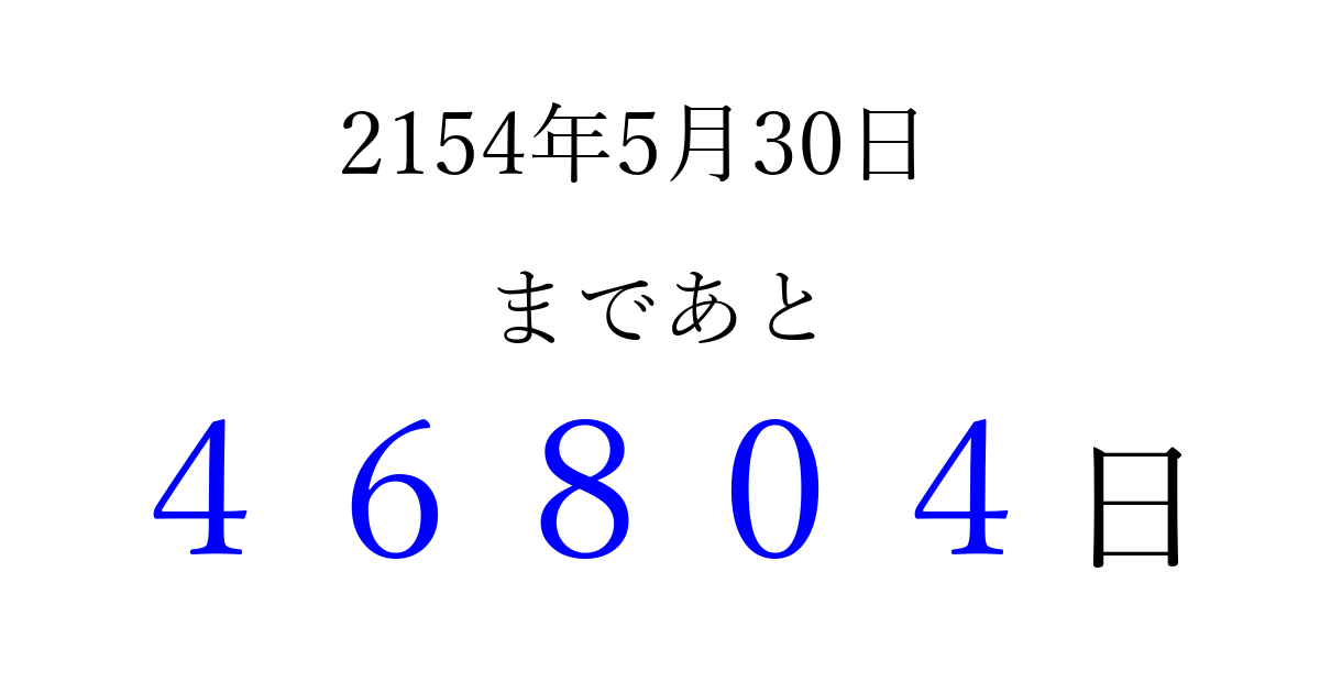 2154年5月30日(木)まで あと 99999 日です 追加すると、トップページからすぐ選べるようになります ※2026/04/07現在の結果です。 最新の状態に更新する ↓シェアして、タイムライン上にカウントダウンを表示しよう!↓ 📤 この結果を共有する Tweet シェア Threads Bluesky 別の日付でカウントダウン 2154年5月のカレンダー このページをブックマークに追加すると、いつでもカウントダウンを確認できます。 (PC: Ctrl+D / Mac: ⌘+D) hitome-notes.comでは以下のページも運営しています。 指定日と期間から日付を計算 | ガチャ確率計算・シミュレーション | プライバシー・ポリシー 運営者:Avocado