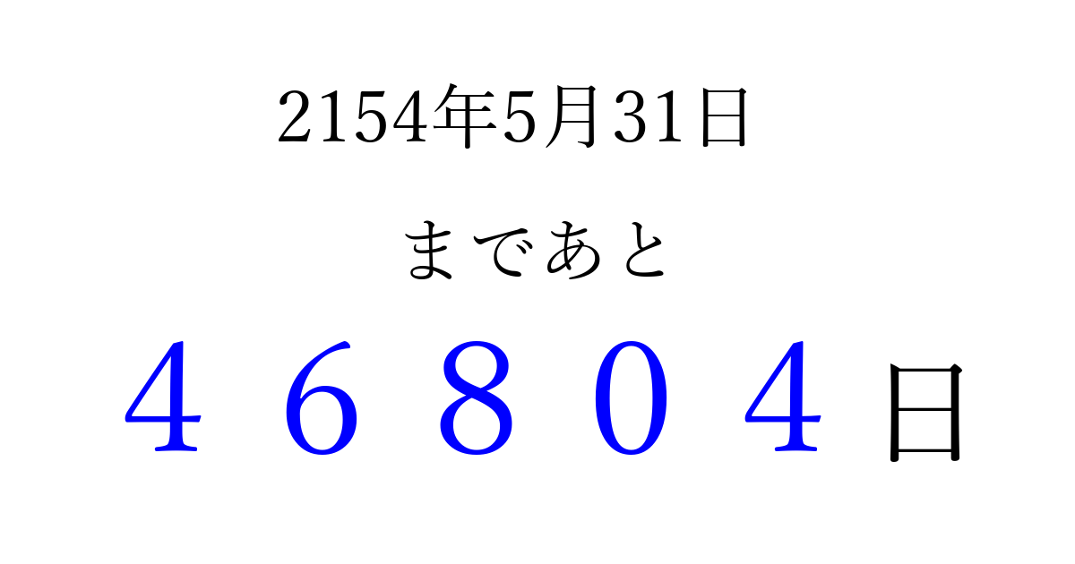2154年5月31日(金)まで あと 99999 日です 追加すると、トップページからすぐ選べるようになります ※2026/04/08現在の結果です。 最新の状態に更新する ↓シェアして、タイムライン上にカウントダウンを表示しよう!↓ 📤 この結果を共有する Tweet シェア Threads Bluesky 別の日付でカウントダウン 2154年5月のカレンダー このページをブックマークに追加すると、いつでもカウントダウンを確認できます。 (PC: Ctrl+D / Mac: ⌘+D) hitome-notes.comでは以下のページも運営しています。 指定日と期間から日付を計算 | ガチャ確率計算・シミュレーション | プライバシー・ポリシー 運営者:Avocado