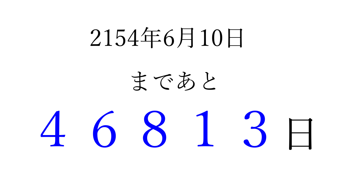2154年6月10日(月)まで あと 99999 日です 追加すると、トップページからすぐ選べるようになります ※2026/04/09現在の結果です。 最新の状態に更新する ↓シェアして、タイムライン上にカウントダウンを表示しよう!↓ 📤 この結果を共有する Tweet シェア Threads Bluesky 別の日付でカウントダウン 2154年6月のカレンダー このページをブックマークに追加すると、いつでもカウントダウンを確認できます。 (PC: Ctrl+D / Mac: ⌘+D) hitome-notes.comでは以下のページも運営しています。 指定日と期間から日付を計算 | ガチャ確率計算・シミュレーション | プライバシー・ポリシー 運営者:Avocado