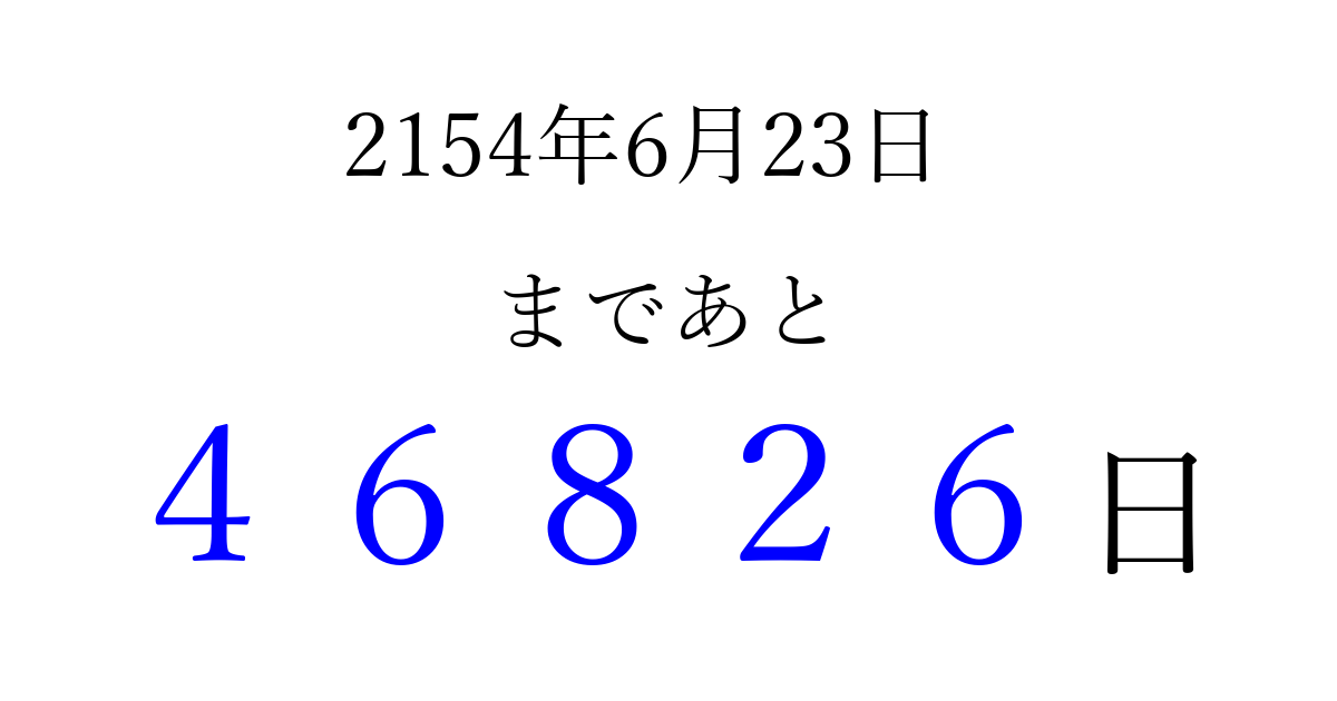 2154年6月23日(日)まで あと 99999 日です 追加すると、トップページからすぐ選べるようになります ※2026/04/09現在の結果です。 最新の状態に更新する ↓シェアして、タイムライン上にカウントダウンを表示しよう!↓ 📤 この結果を共有する Tweet シェア Threads Bluesky 別の日付でカウントダウン 2154年6月のカレンダー このページをブックマークに追加すると、いつでもカウントダウンを確認できます。 (PC: Ctrl+D / Mac: ⌘+D) hitome-notes.comでは以下のページも運営しています。 指定日と期間から日付を計算 | ガチャ確率計算・シミュレーション | プライバシー・ポリシー 運営者:Avocado