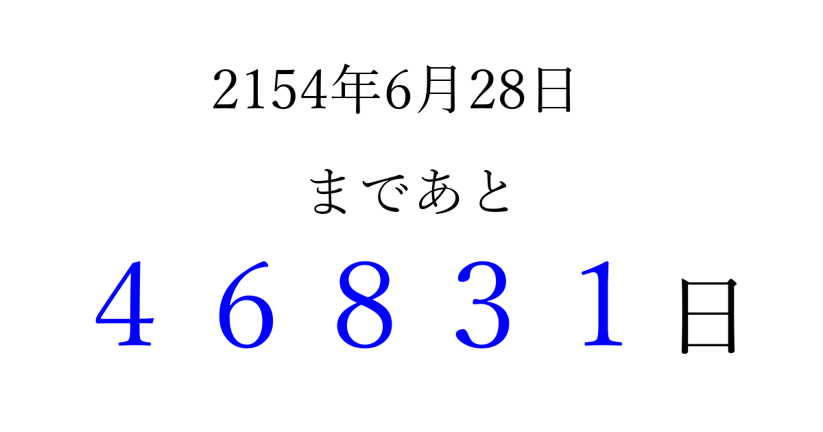 2154年6月28日(金)まで あと 99999 日です 追加すると、トップページからすぐ選べるようになります ※2026/04/09現在の結果です。 最新の状態に更新する ↓シェアして、タイムライン上にカウントダウンを表示しよう!↓ 📤 この結果を共有する Tweet シェア Threads Bluesky 別の日付でカウントダウン 2154年6月のカレンダー このページをブックマークに追加すると、いつでもカウントダウンを確認できます。 (PC: Ctrl+D / Mac: ⌘+D) hitome-notes.comでは以下のページも運営しています。 指定日と期間から日付を計算 | ガチャ確率計算・シミュレーション | プライバシー・ポリシー 運営者:Avocado