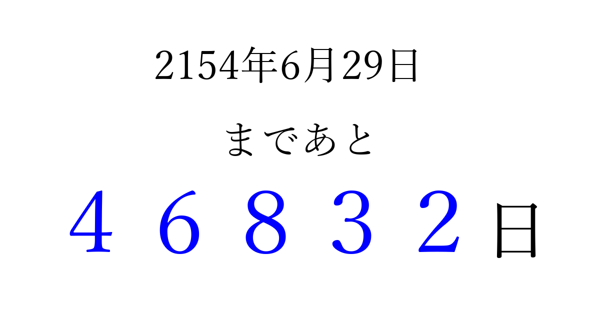 2154年6月29日(土)まで あと 99999 日です 追加すると、トップページからすぐ選べるようになります ※2026/04/09現在の結果です。 最新の状態に更新する ↓シェアして、タイムライン上にカウントダウンを表示しよう!↓ 📤 この結果を共有する Tweet シェア Threads Bluesky 別の日付でカウントダウン 2154年6月のカレンダー このページをブックマークに追加すると、いつでもカウントダウンを確認できます。 (PC: Ctrl+D / Mac: ⌘+D) hitome-notes.comでは以下のページも運営しています。 指定日と期間から日付を計算 | ガチャ確率計算・シミュレーション | プライバシー・ポリシー 運営者:Avocado