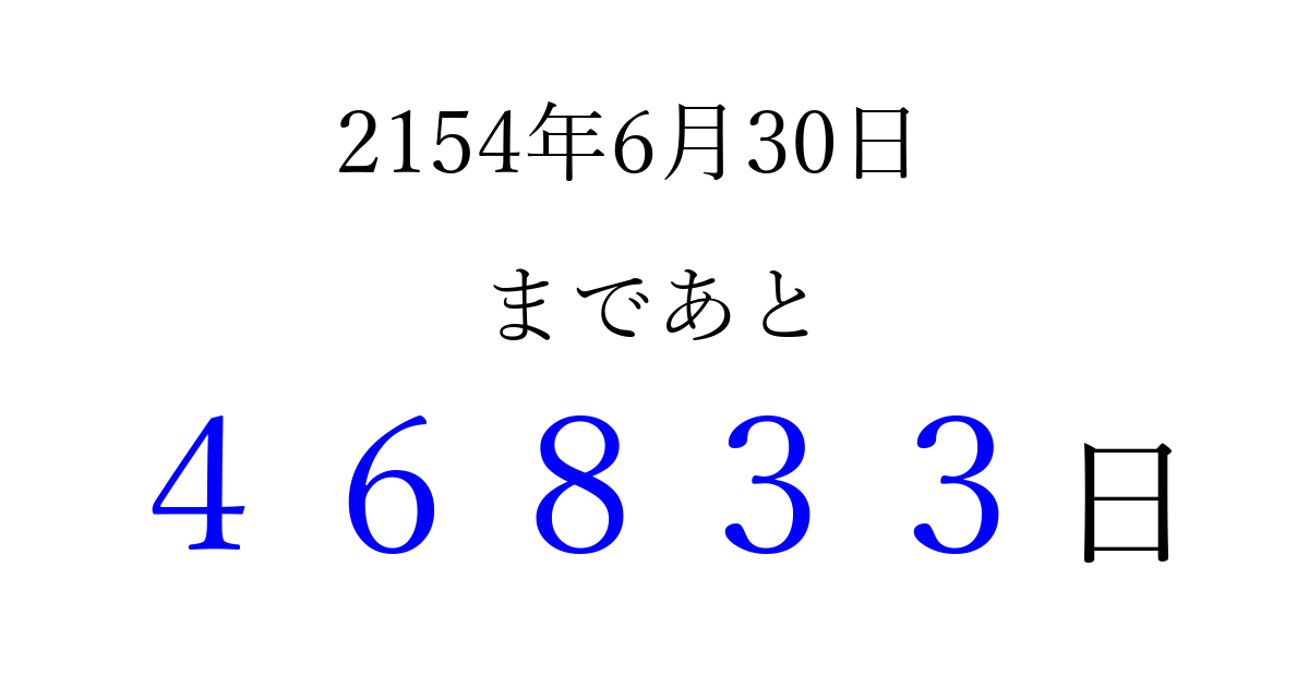 2154年6月30日(日)まで あと 99999 日です 追加すると、トップページからすぐ選べるようになります ※2026/04/09現在の結果です。 最新の状態に更新する ↓シェアして、タイムライン上にカウントダウンを表示しよう!↓ 📤 この結果を共有する Tweet シェア Threads Bluesky 別の日付でカウントダウン 2154年6月のカレンダー このページをブックマークに追加すると、いつでもカウントダウンを確認できます。 (PC: Ctrl+D / Mac: ⌘+D) hitome-notes.comでは以下のページも運営しています。 指定日と期間から日付を計算 | ガチャ確率計算・シミュレーション | プライバシー・ポリシー 運営者:Avocado