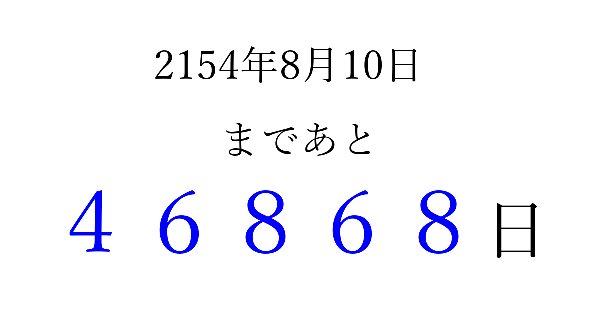 2154年8月10日(土)まで あと 99999 日です 追加すると、トップページからすぐ選べるようになります ※2026/04/15現在の結果です。 最新の状態に更新する ↓シェアして、タイムライン上にカウントダウンを表示しよう!↓ 📤 この結果を共有する Tweet シェア Threads Bluesky 別の日付でカウントダウン 2154年8月のカレンダー このページをブックマークに追加すると、いつでもカウントダウンを確認できます。 (PC: Ctrl+D / Mac: ⌘+D) hitome-notes.comでは以下のページも運営しています。 指定日と期間から日付を計算 | ガチャ確率計算・シミュレーション | プライバシー・ポリシー 運営者:Avocado