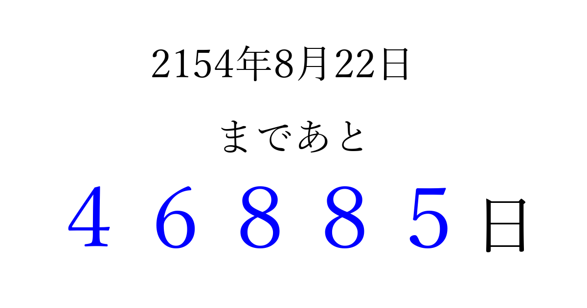 2154年8月22日(木)まで あと 99999 日です 追加すると、トップページからすぐ選べるようになります ※2026/04/10現在の結果です。 最新の状態に更新する ↓シェアして、タイムライン上にカウントダウンを表示しよう!↓ 📤 この結果を共有する Tweet シェア Threads Bluesky 別の日付でカウントダウン 2154年8月のカレンダー このページをブックマークに追加すると、いつでもカウントダウンを確認できます。 (PC: Ctrl+D / Mac: ⌘+D) hitome-notes.comでは以下のページも運営しています。 指定日と期間から日付を計算 | ガチャ確率計算・シミュレーション | プライバシー・ポリシー 運営者:Avocado