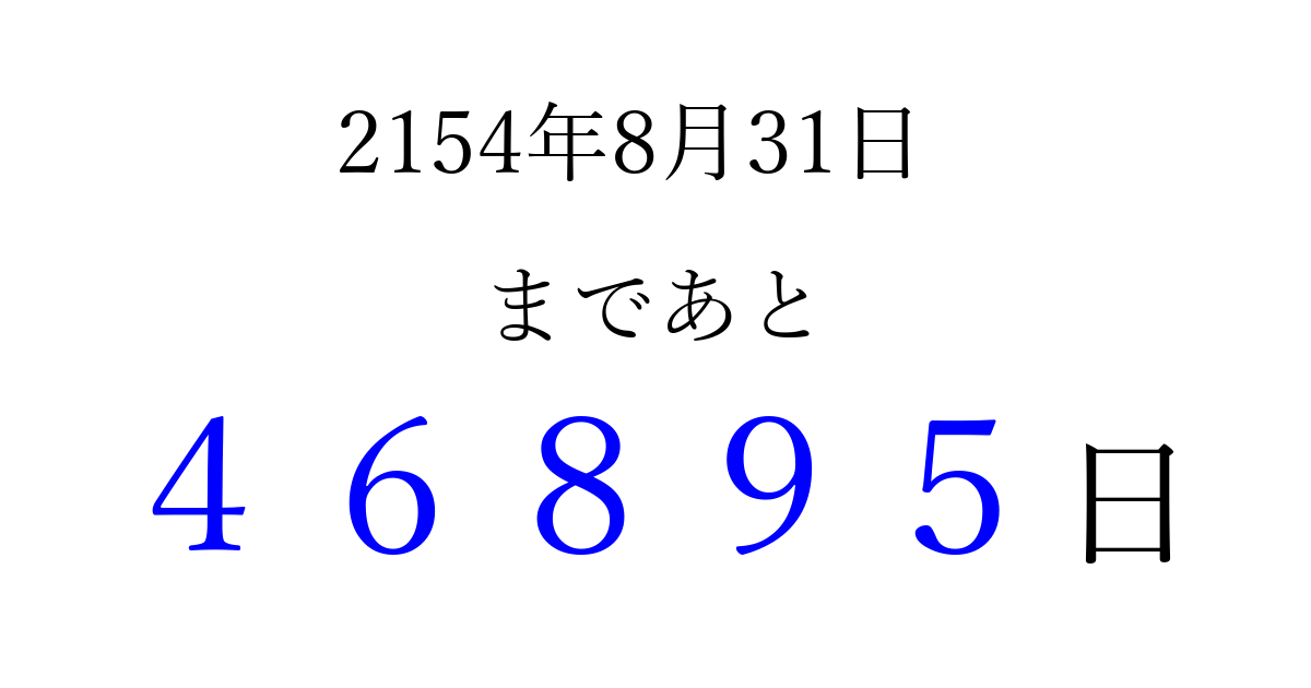 2154年8月31日(土)まで あと 99999 日です 追加すると、トップページからすぐ選べるようになります ※2026/04/09現在の結果です。 最新の状態に更新する ↓シェアして、タイムライン上にカウントダウンを表示しよう!↓ 📤 この結果を共有する Tweet シェア Threads Bluesky 別の日付でカウントダウン 2154年8月のカレンダー このページをブックマークに追加すると、いつでもカウントダウンを確認できます。 (PC: Ctrl+D / Mac: ⌘+D) hitome-notes.comでは以下のページも運営しています。 指定日と期間から日付を計算 | ガチャ確率計算・シミュレーション | プライバシー・ポリシー 運営者:Avocado